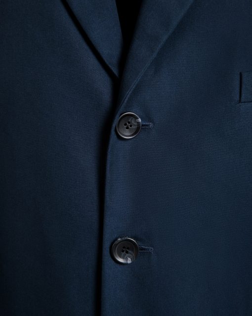 Navy blue notch-lapel blazer in cotton blend fabric with four horn-effect buttons, a half-welt chest pocket, and two patch pockets at the front.