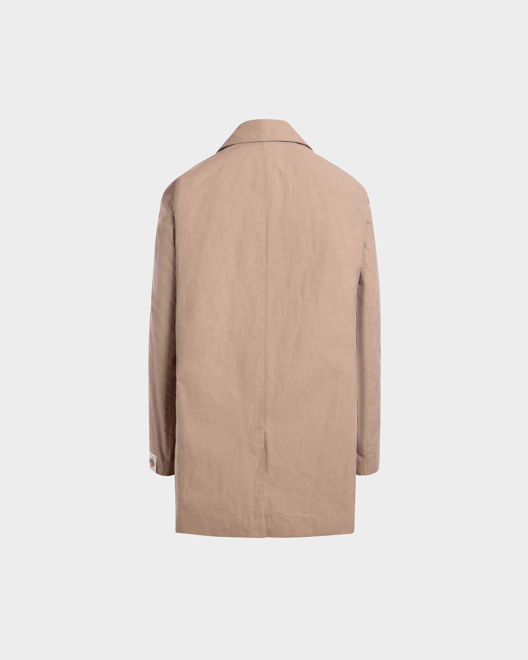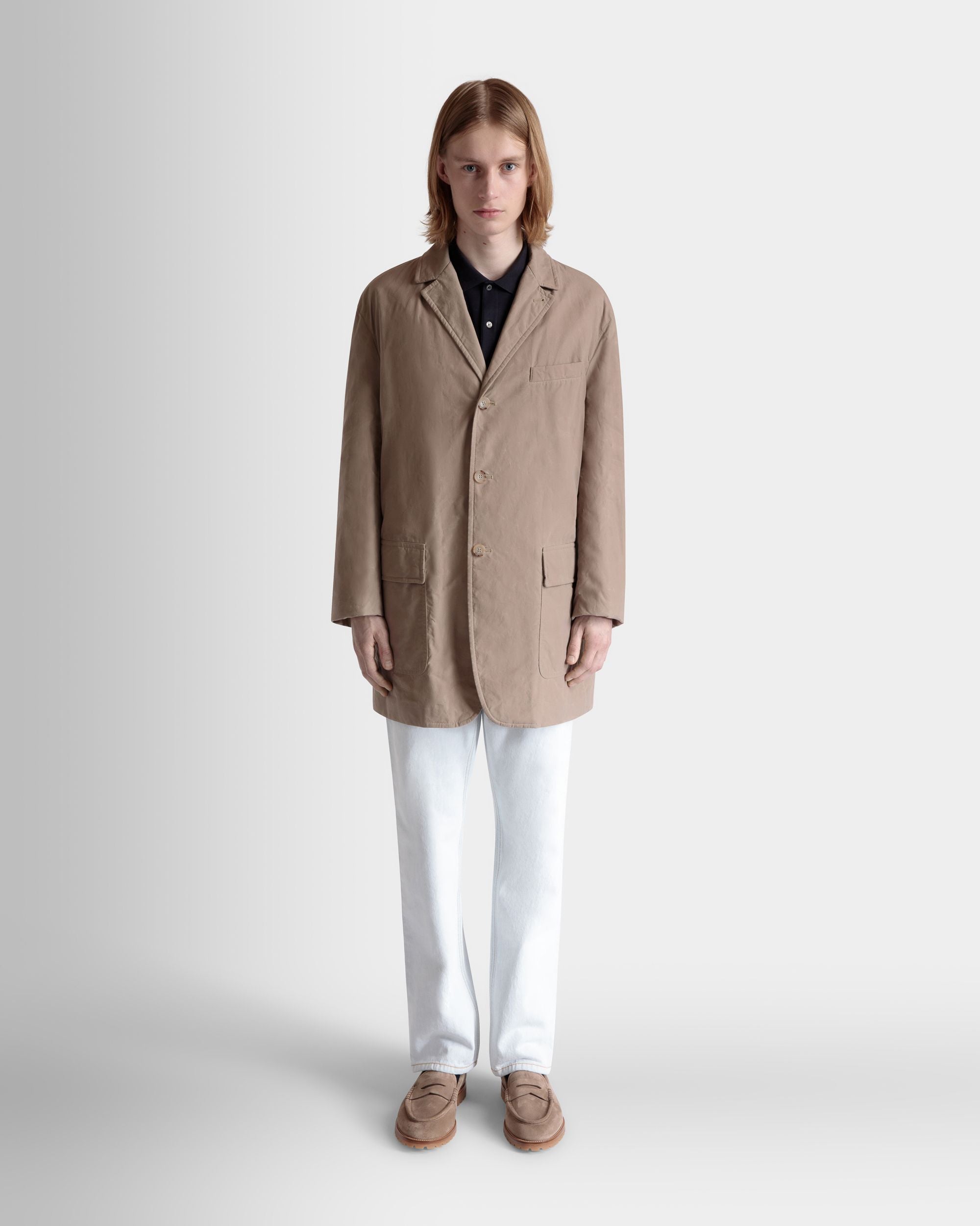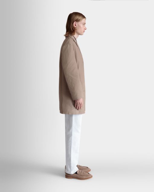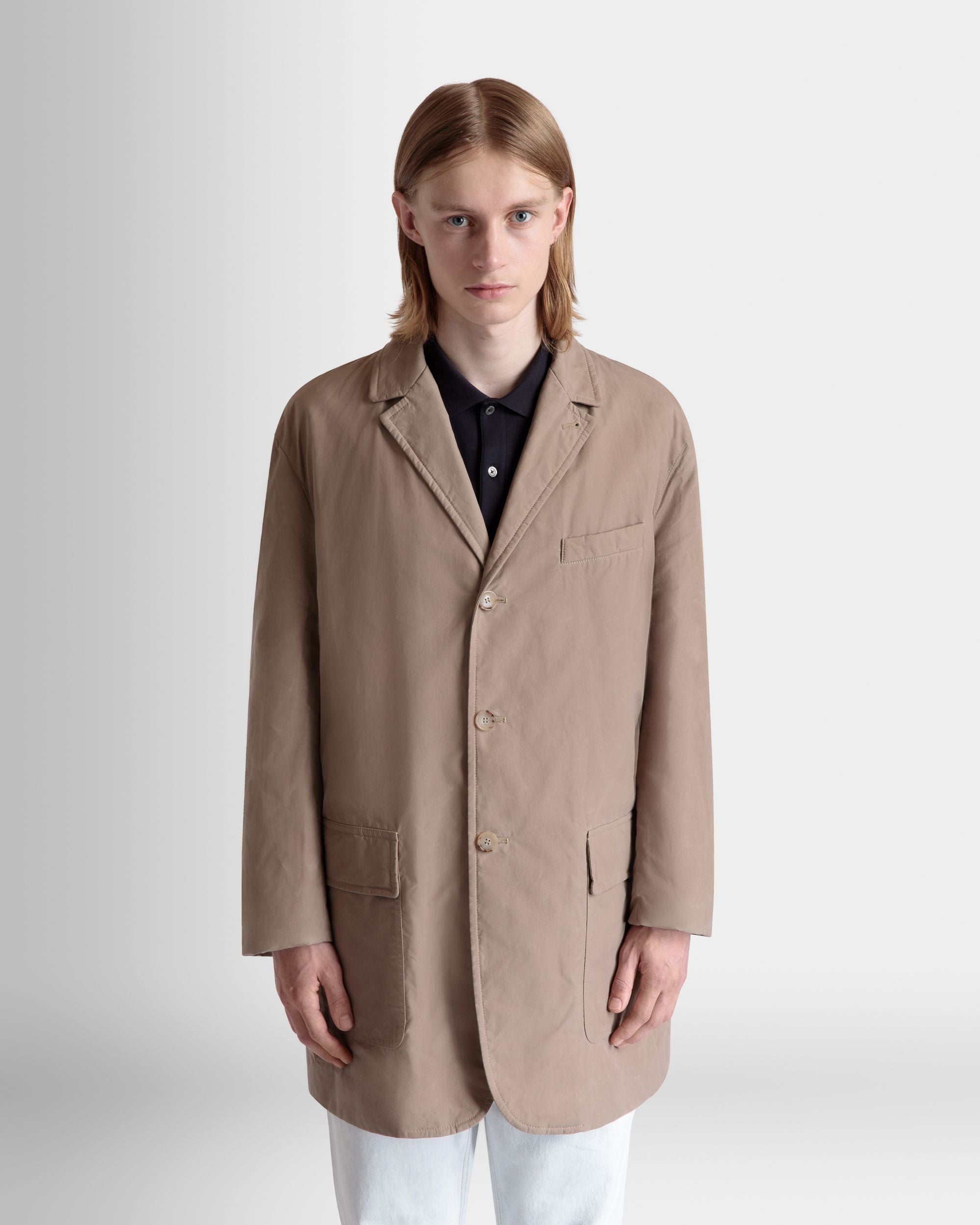 Beige waxed cotton cloth has been used to construct this quilted car coat with three horn-effect buttons and a notch lapel. Two large patch pockets and a half-welt chest pocket hold essential items.