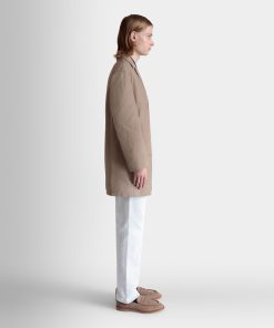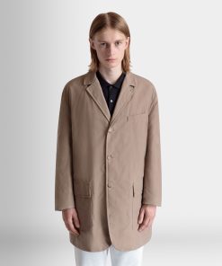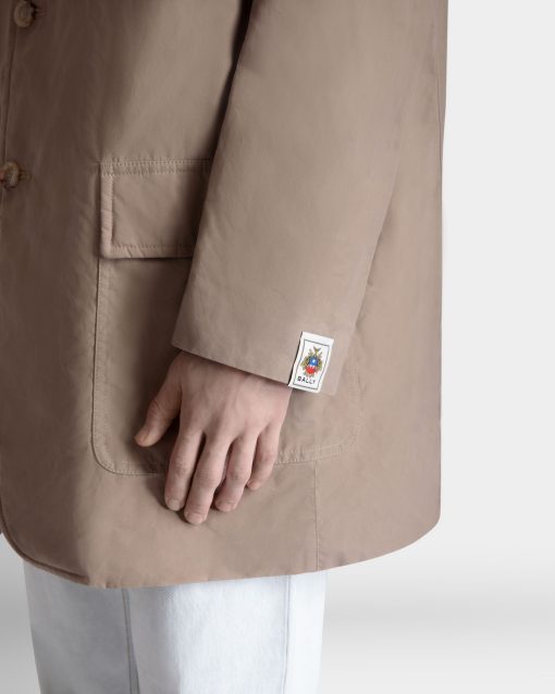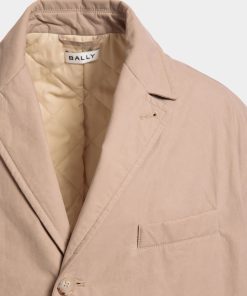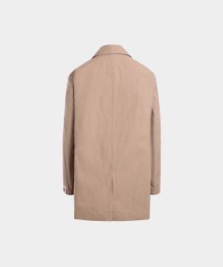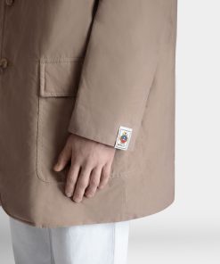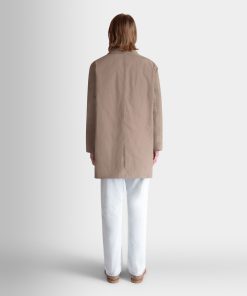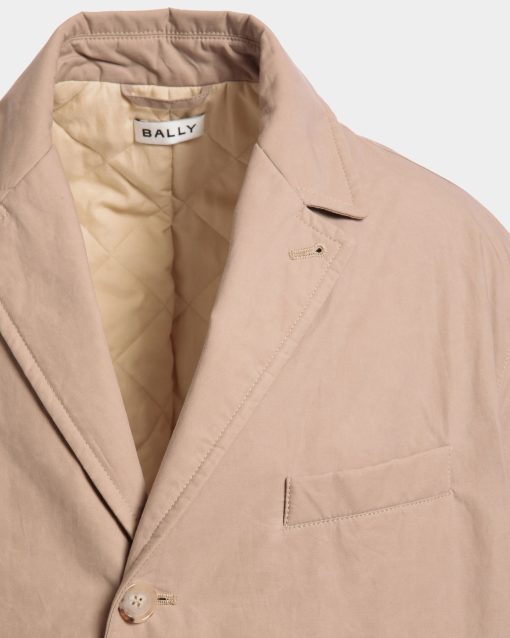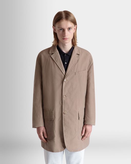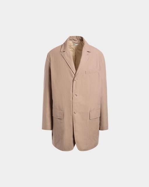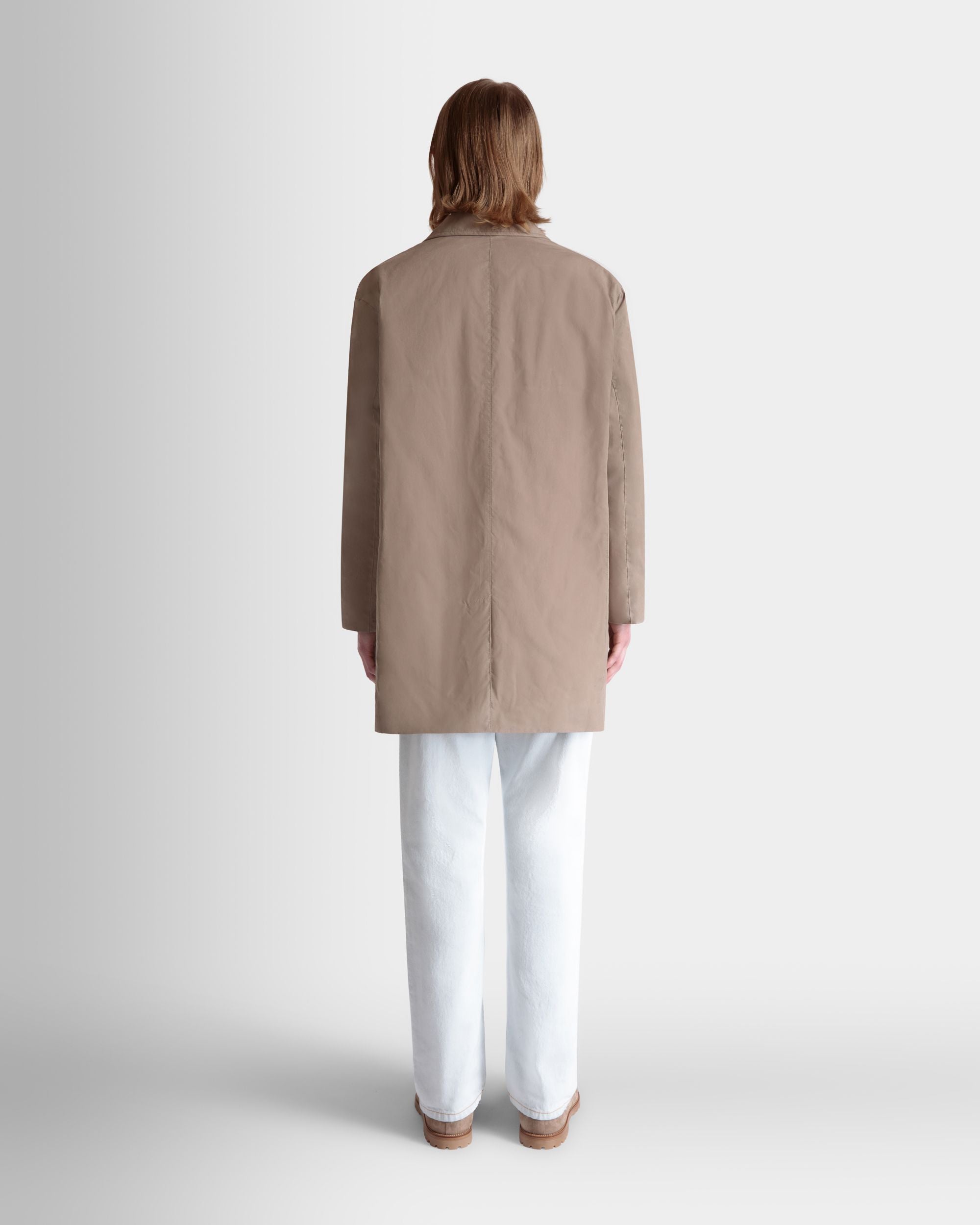 Beige waxed cotton cloth has been used to construct this quilted car coat with three horn-effect buttons and a notch lapel. Two large patch pockets and a half-welt chest pocket hold essential items.