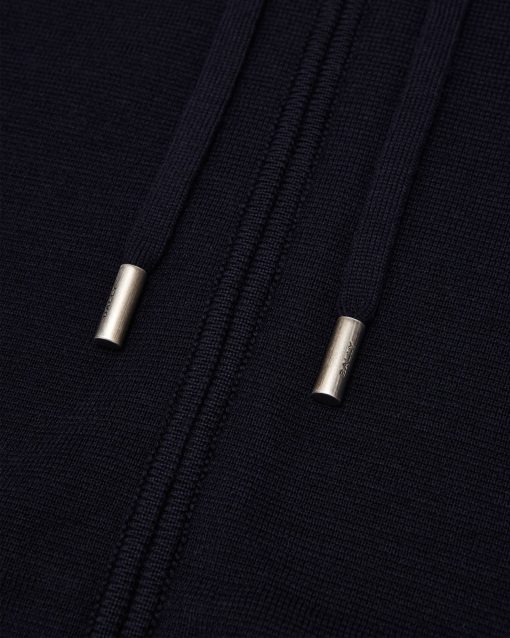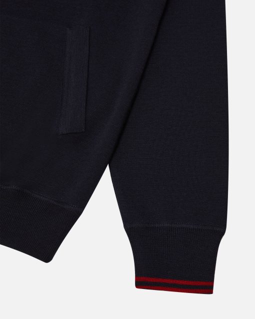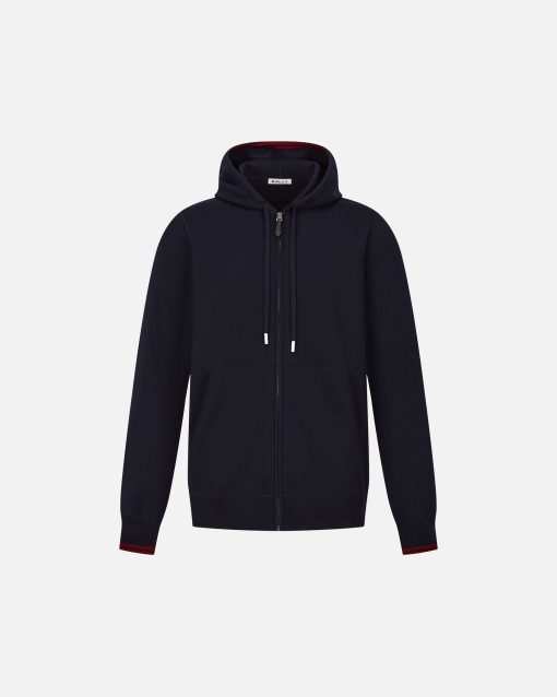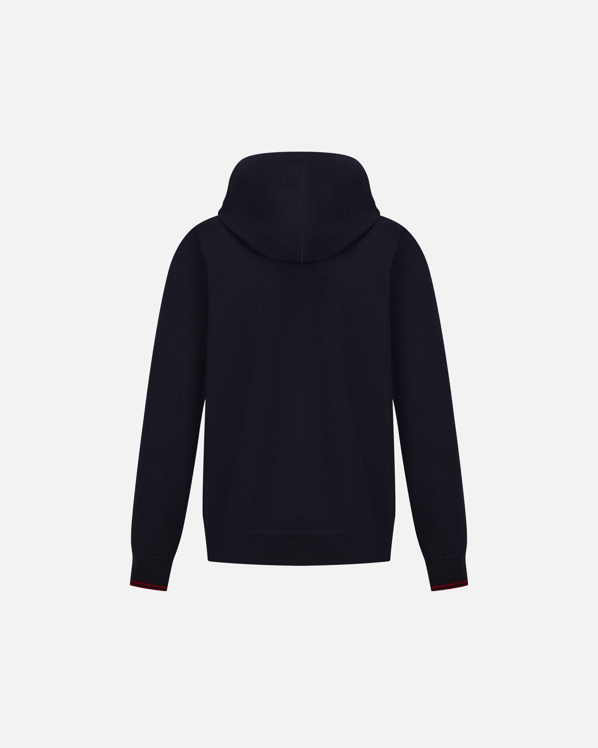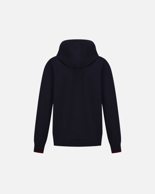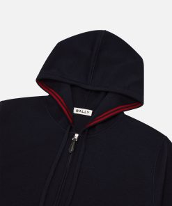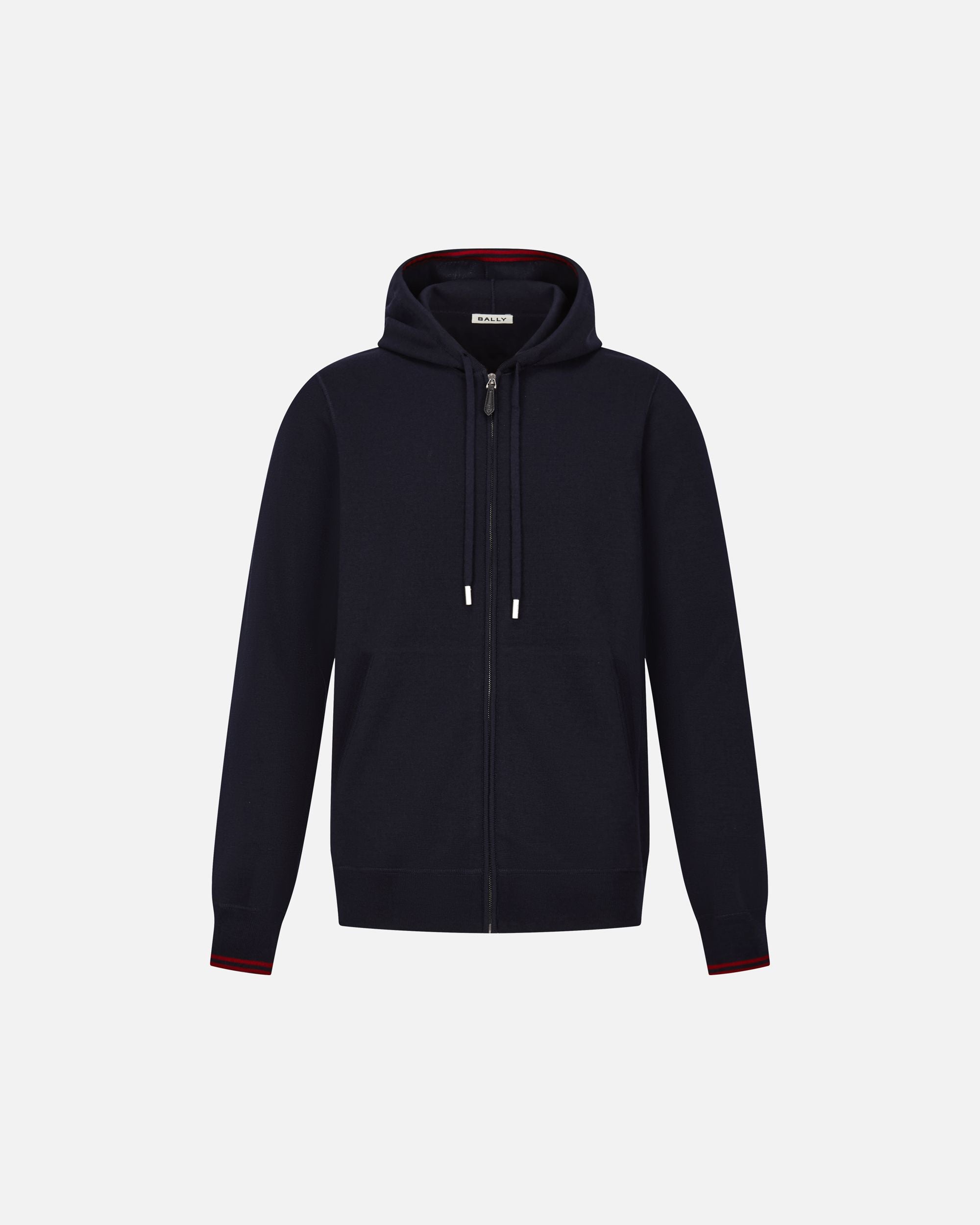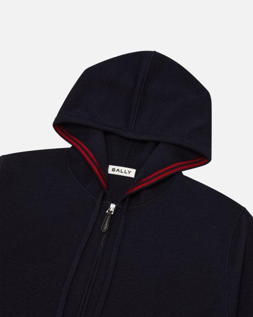 This navy blue wool hoodie is designed for versatility, with a red Bally Ribbon knit into the inside of the hood and on the cuffs.