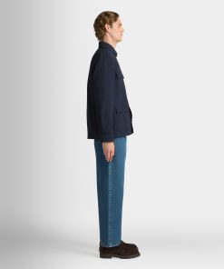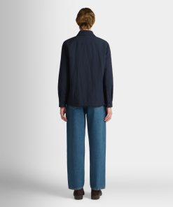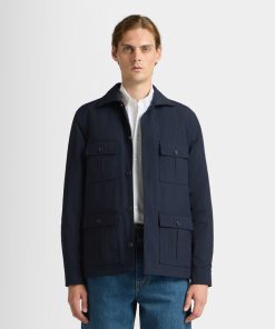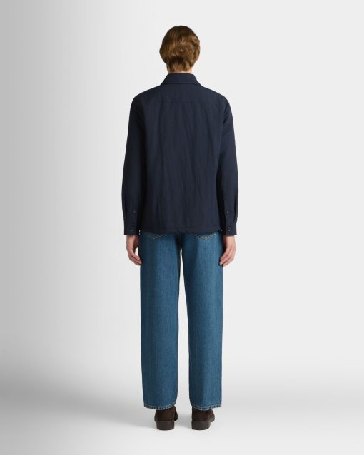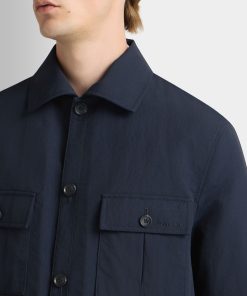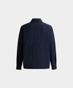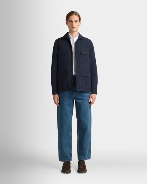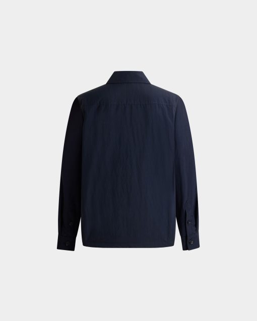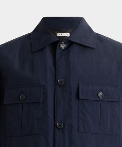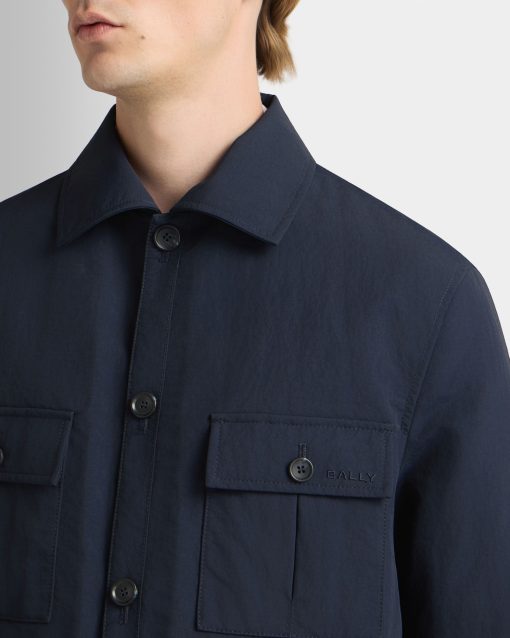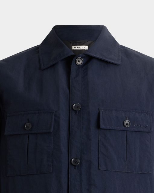 In fine technical fabric, this navy blue overshirt is inspired by utilitarian aesthetics, but with a modern Bally twist. Four bellows pockets with flap closures characterize the front, one with an embroidered logo.