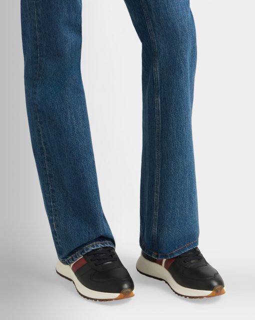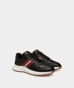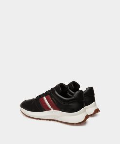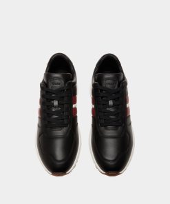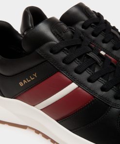 A clean, modern aesthetic defines this Outline sneaker in smooth black calfskin with a red and white Bally Ribbon at the side. The lightweight rubber sole ensures grip on any terrain.