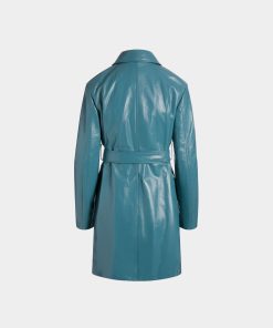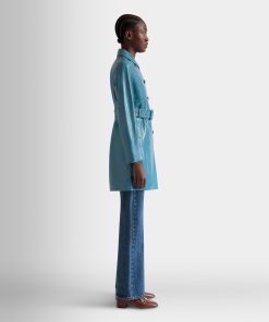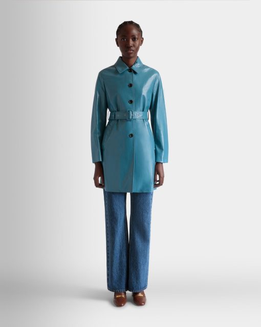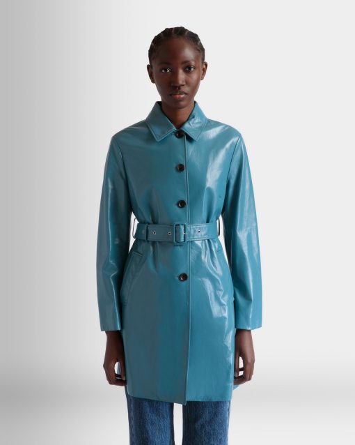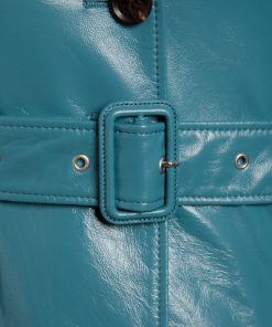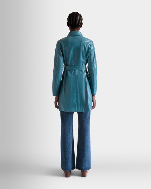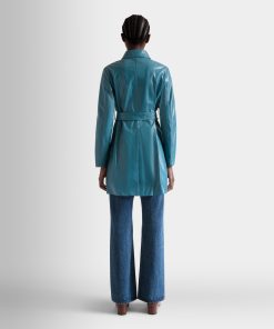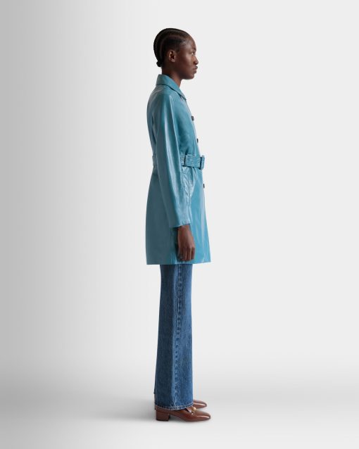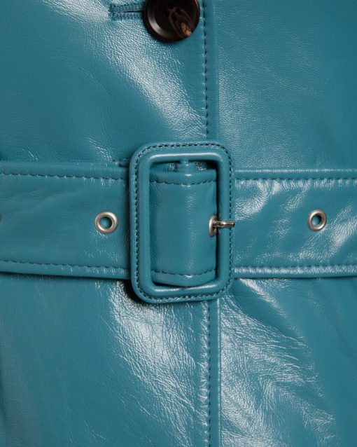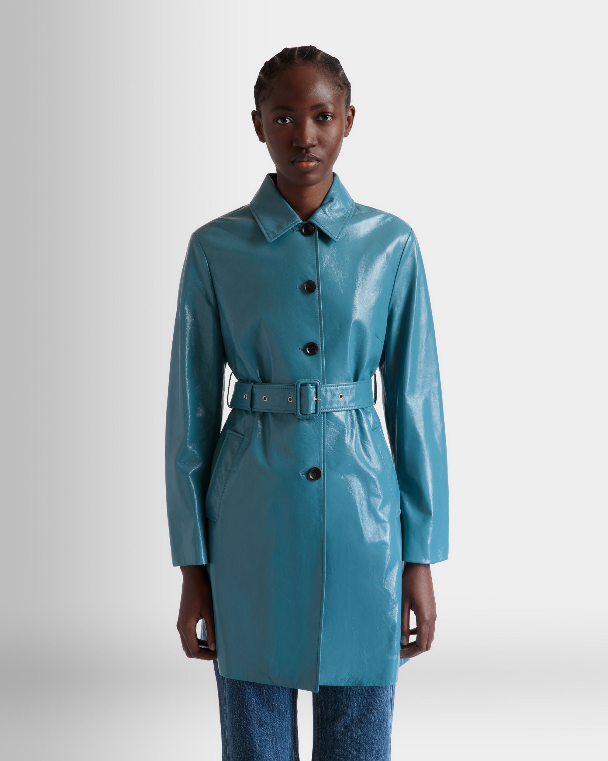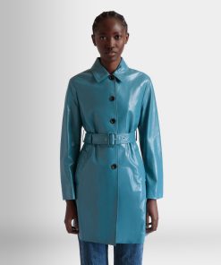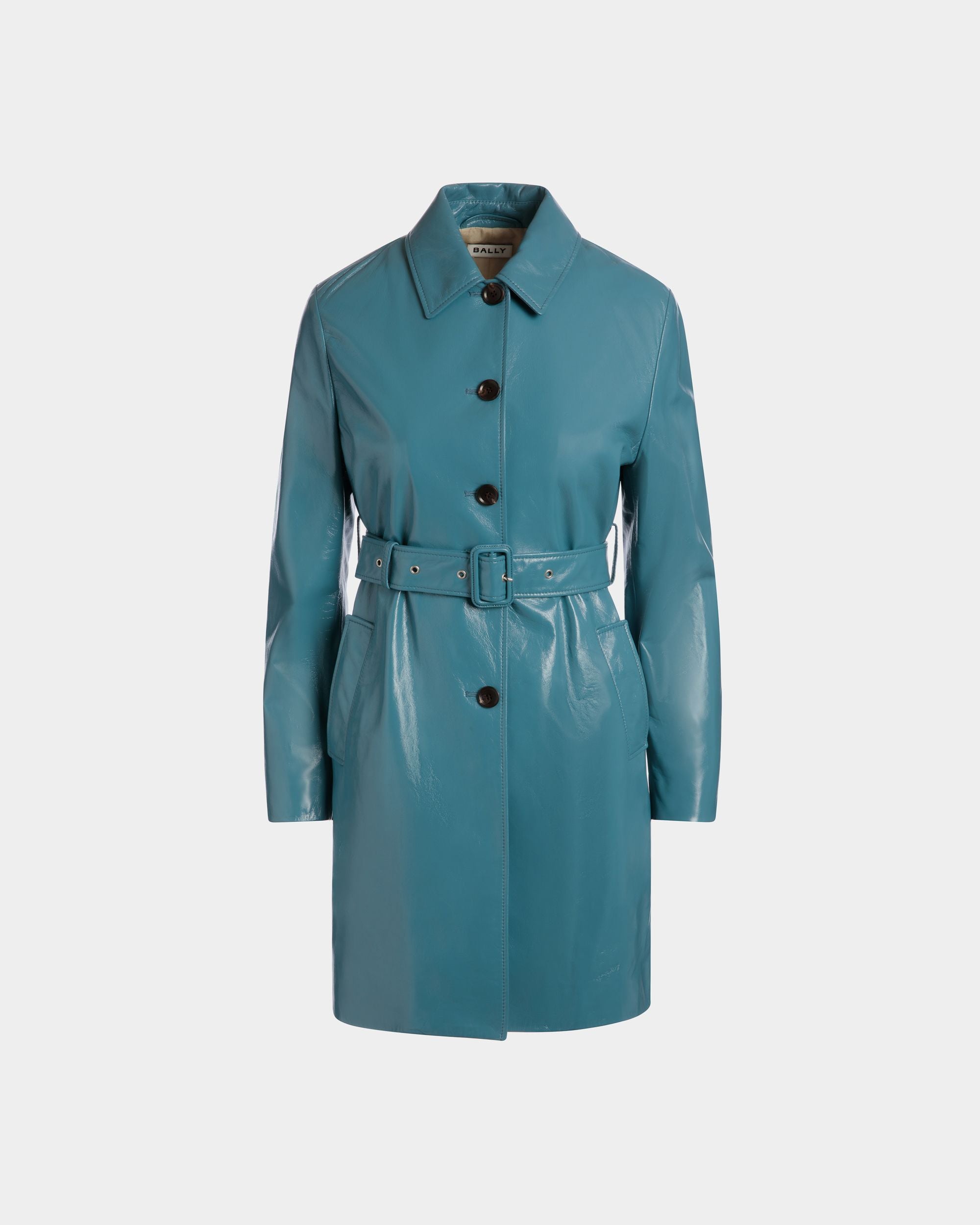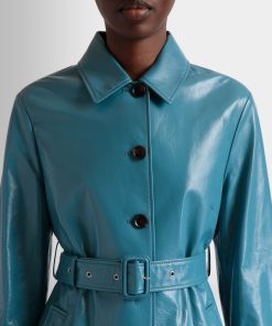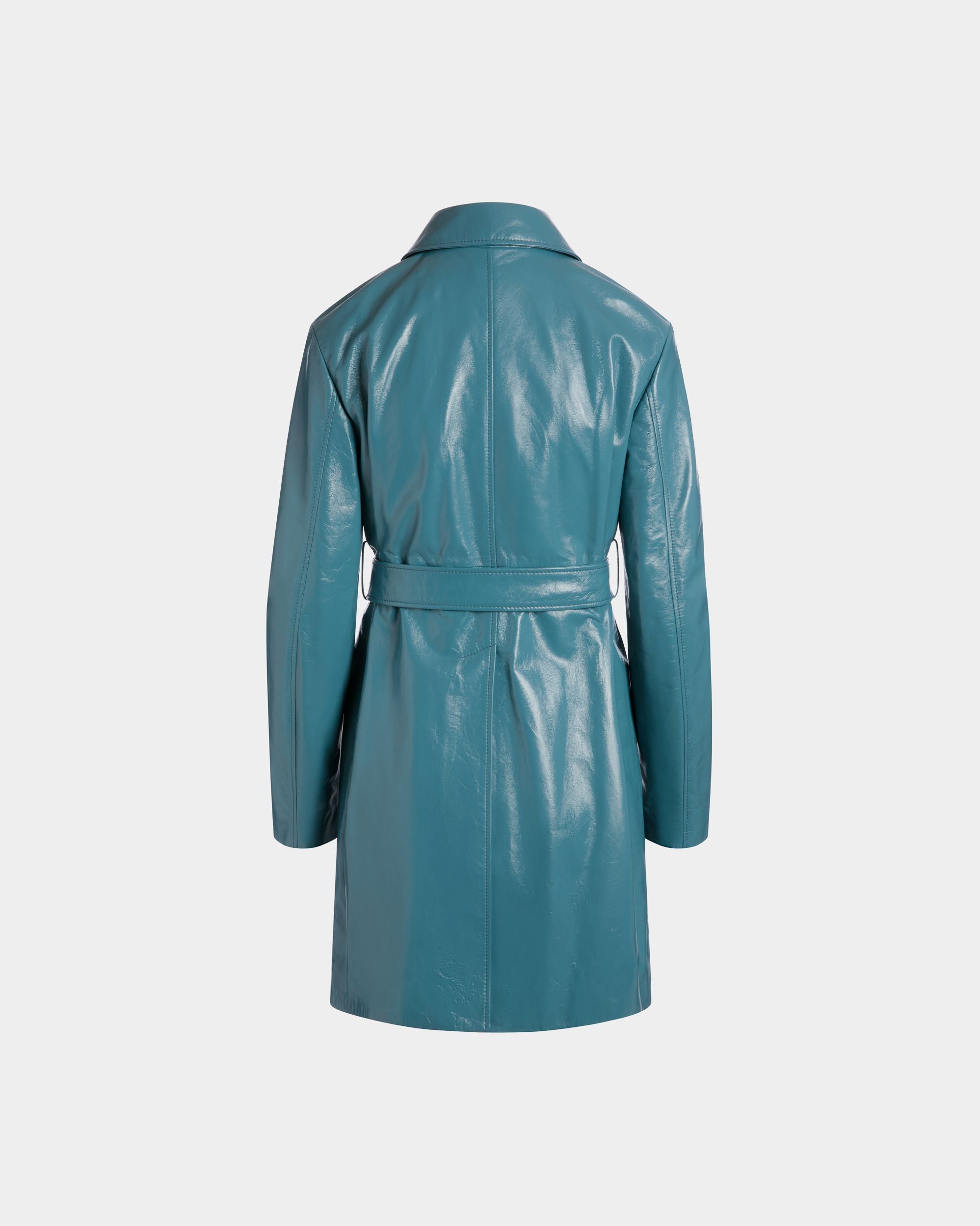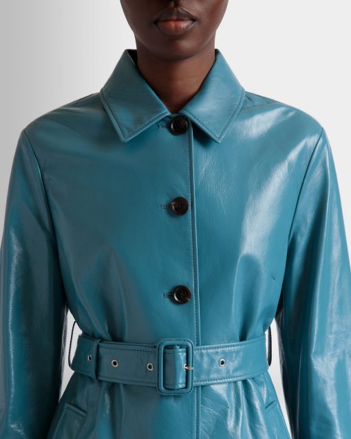 This belted coat is made from fine lambskin with a subtle craquelure texture and a lacquer-effect finish. A self-belt with a leather-covered rectangular buckle adjusts the silhouette.