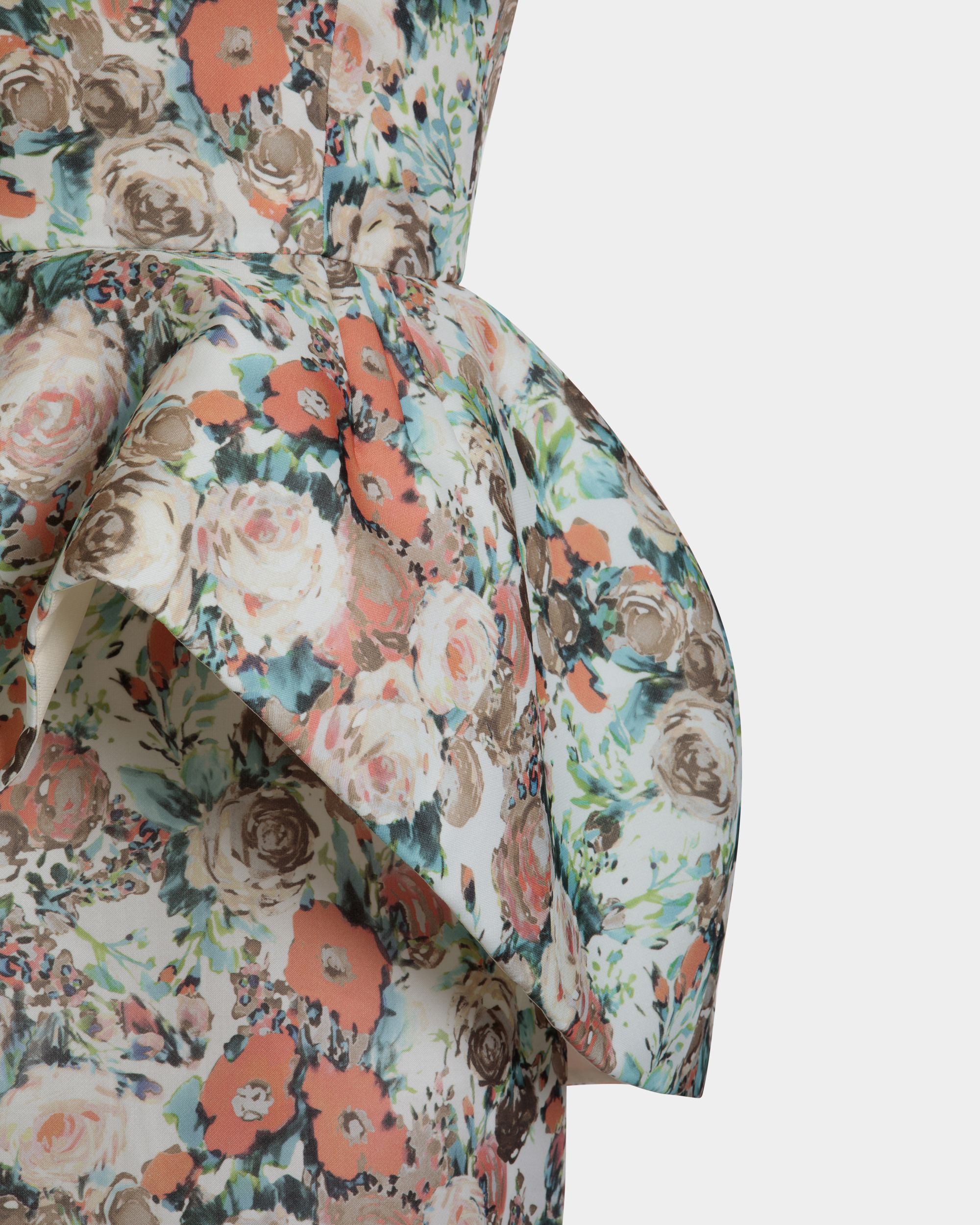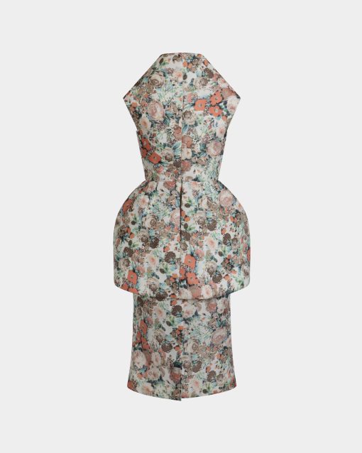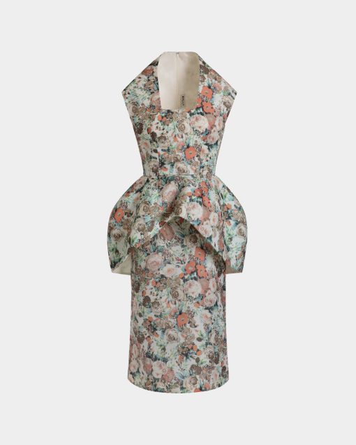 This silk dress has a feminine tulip silhouette, constructed in fine gazar fabric with a romantic floral print.