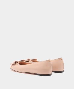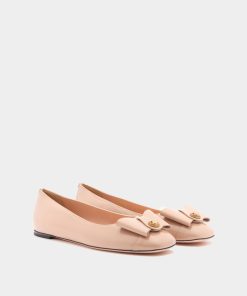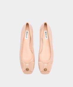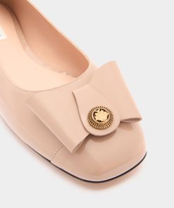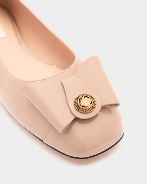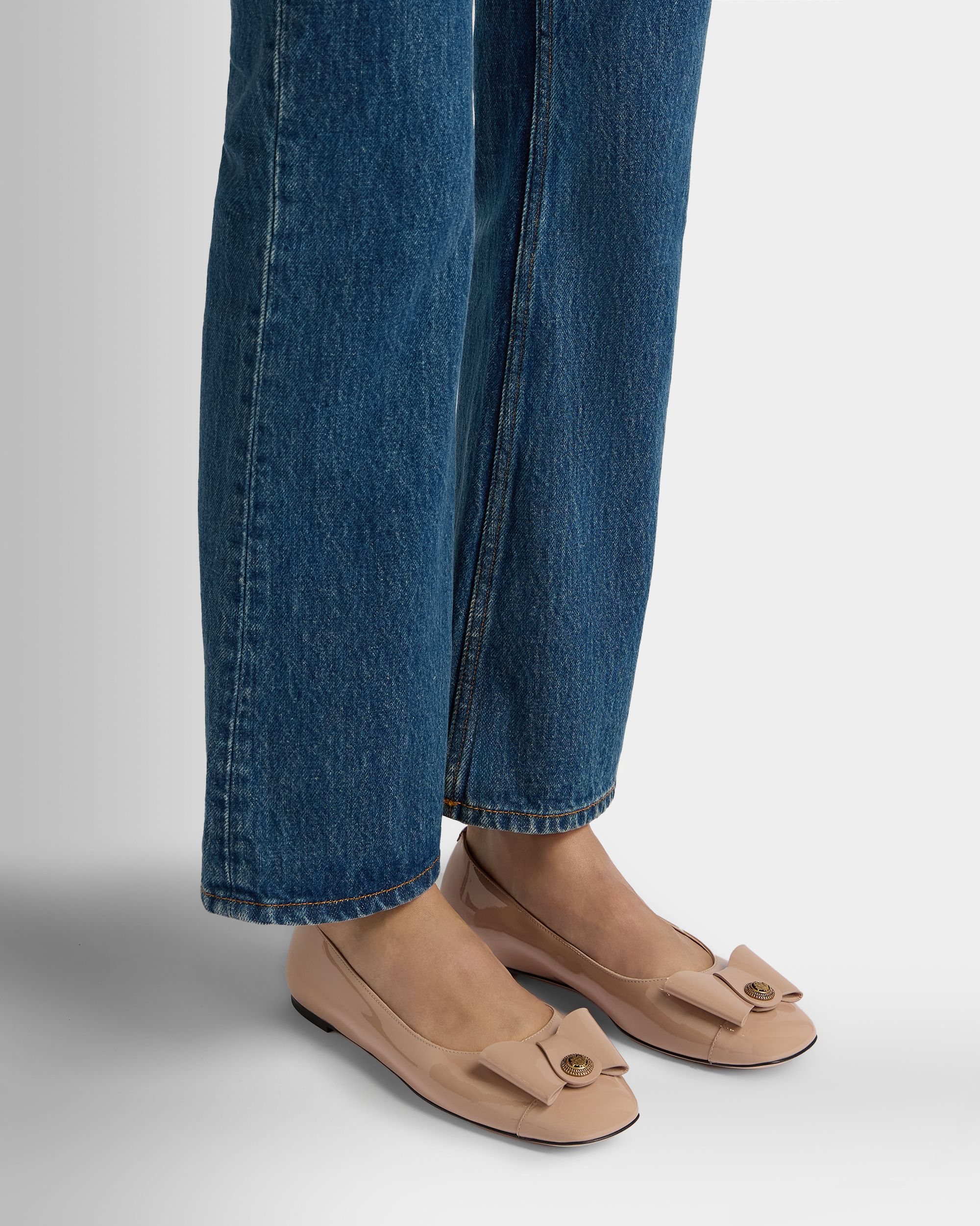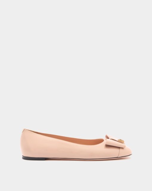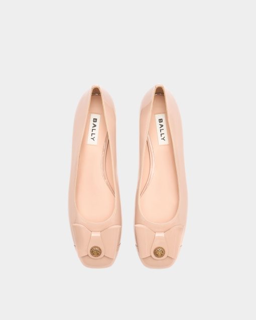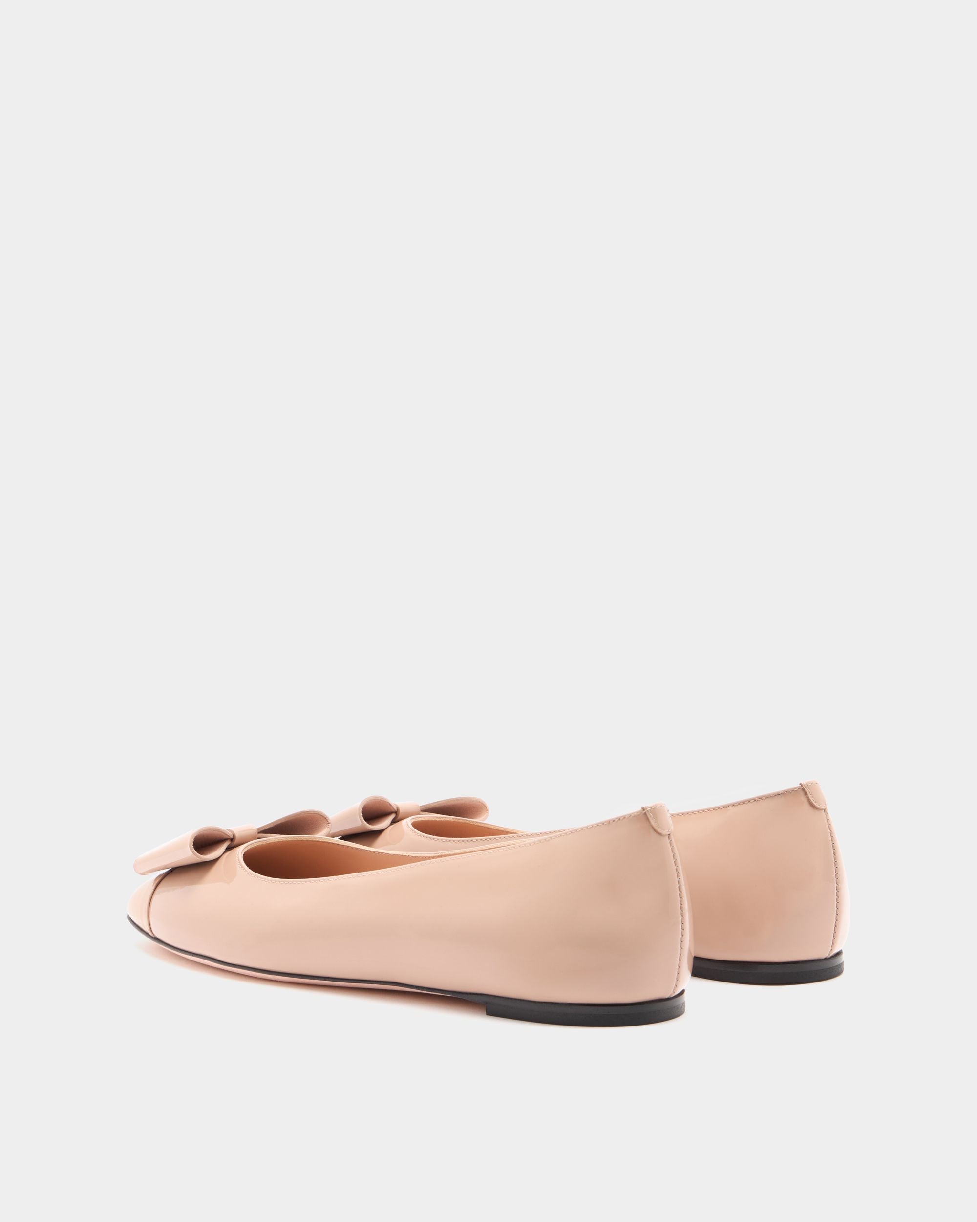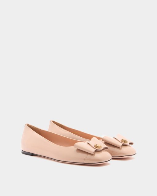 This beige patent leather flat sees a classic ballet design embellished by a B-Bow, a detail inspired by the Bally archives.