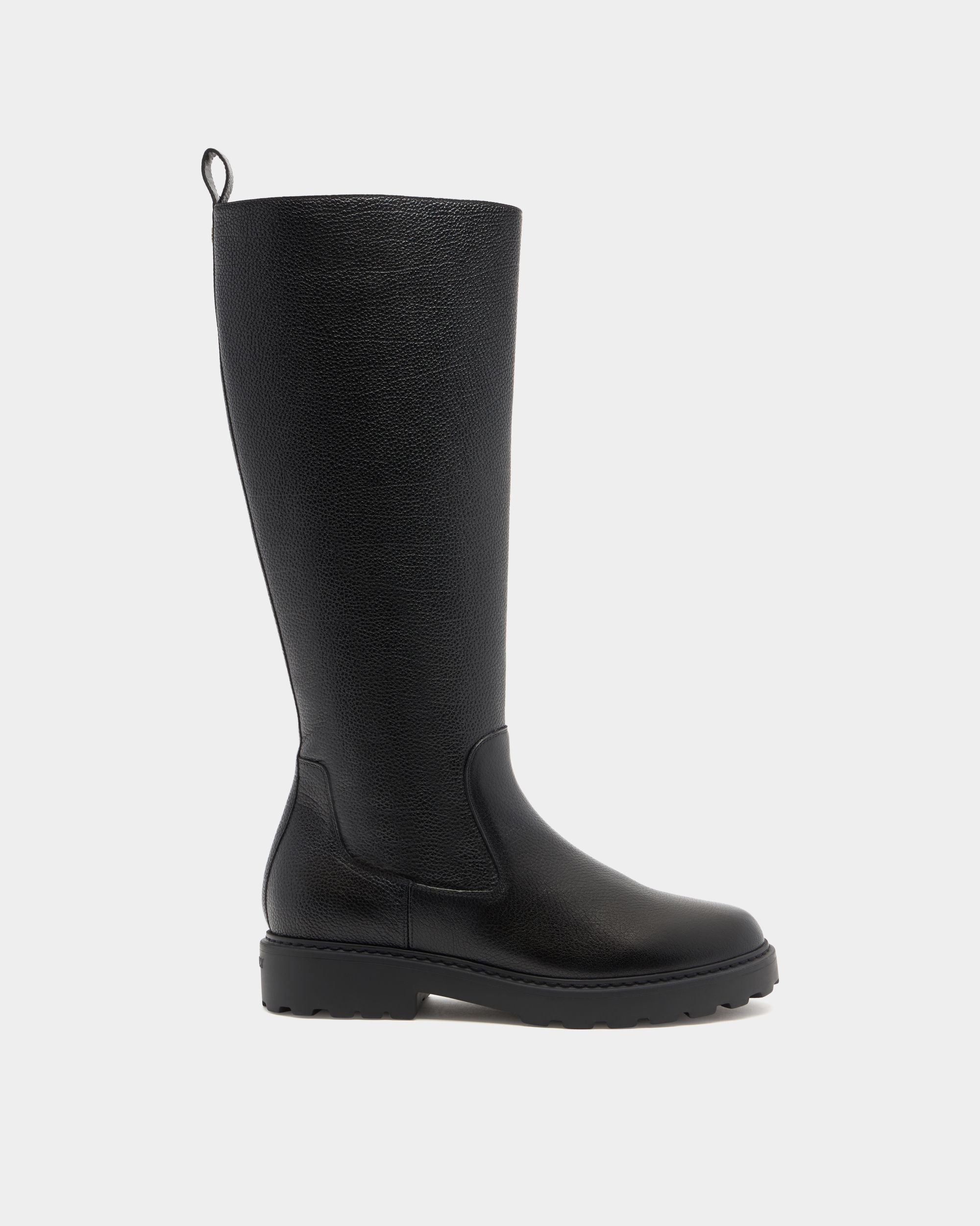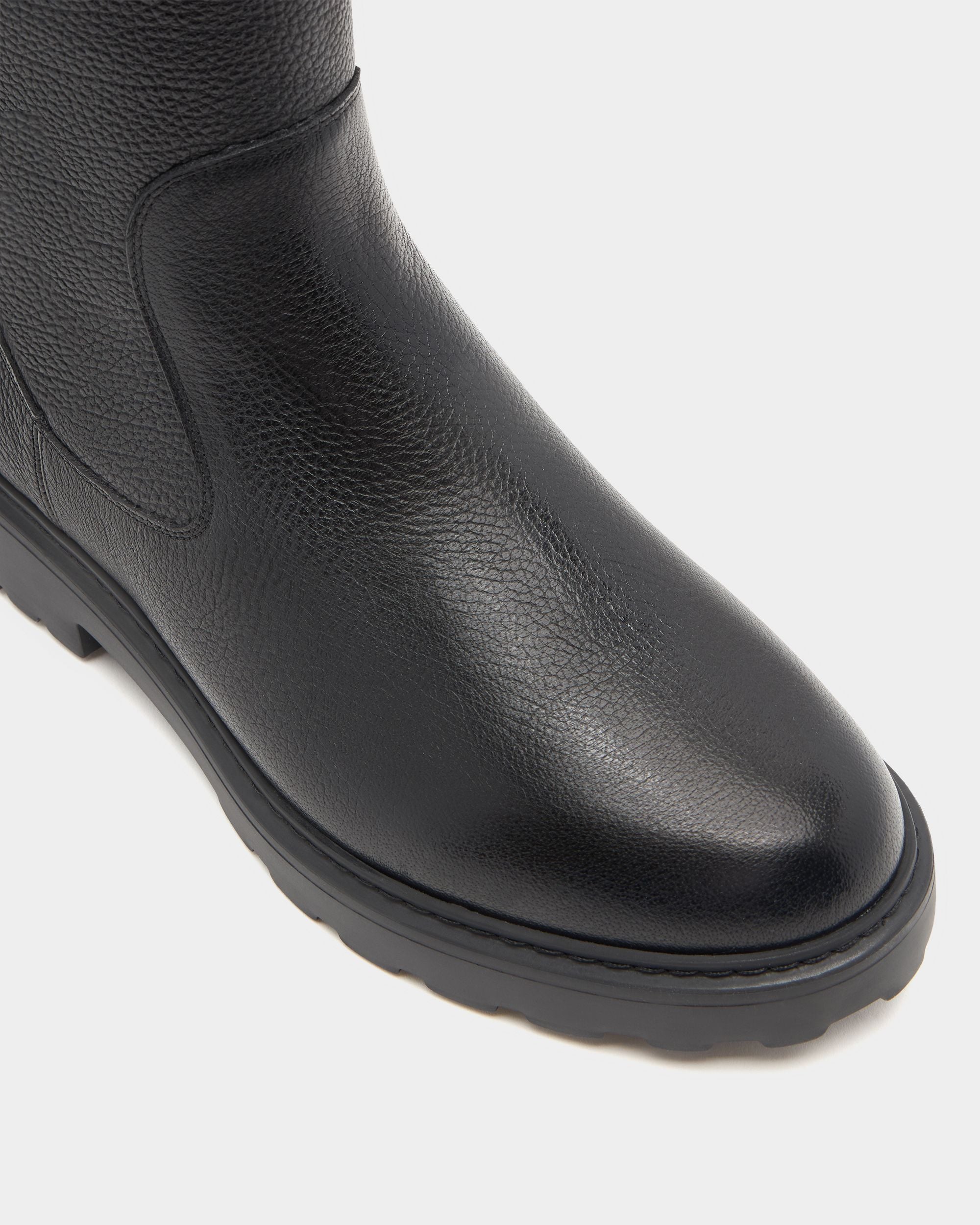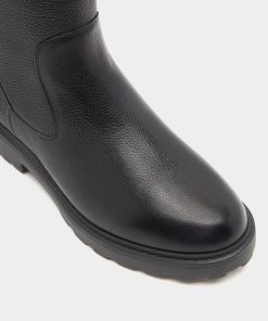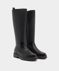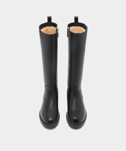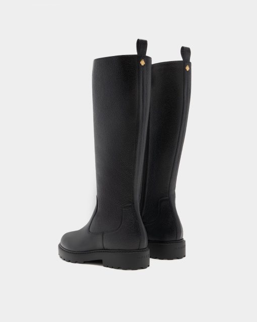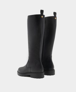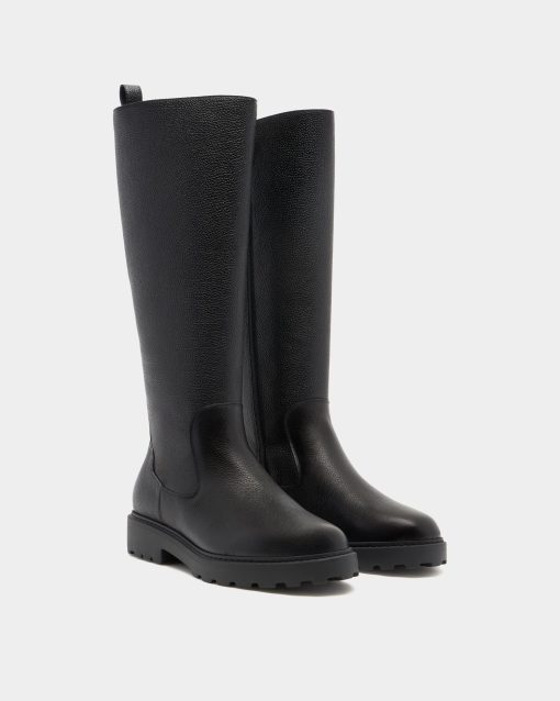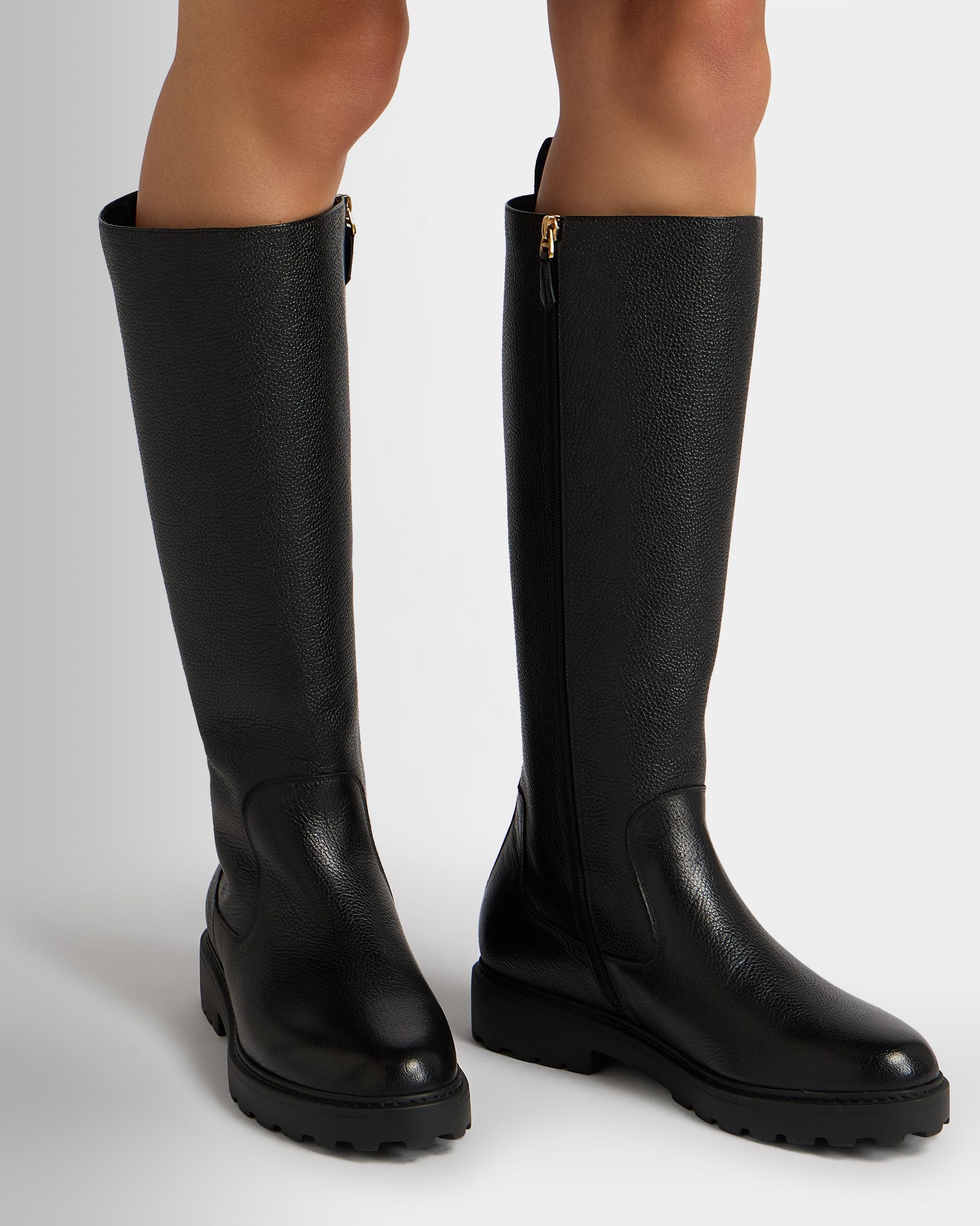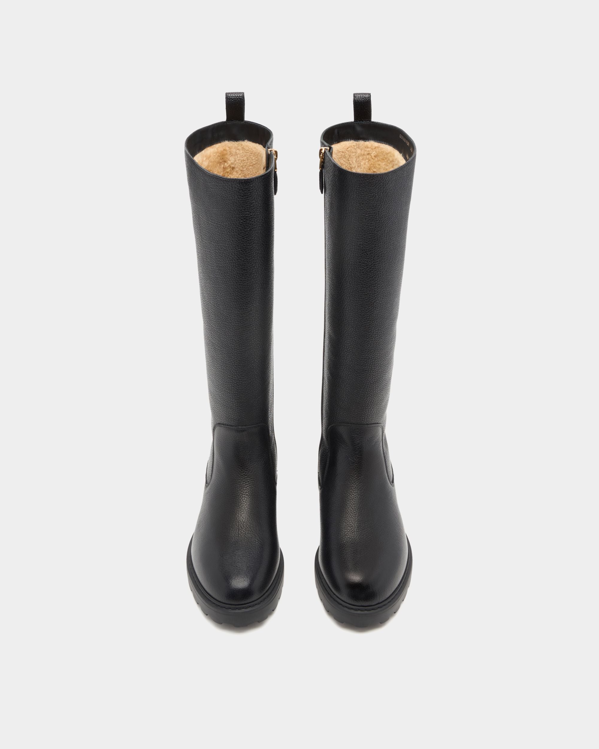 The Gusto tall boot is designed for style and practicality, in black grained leather with warm shearling to the inside, a full-length gold-tone metal zipper and a chunky yet lightweight EVA sole.