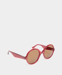 The oversize round lenses of the Ursula sunglasses are bold, curvaceous and iconic. Seen here in red acetate with brown lenses, their sculptural quality is complemented by the equally voluptuous temples, trimmed by the Bally logo.
