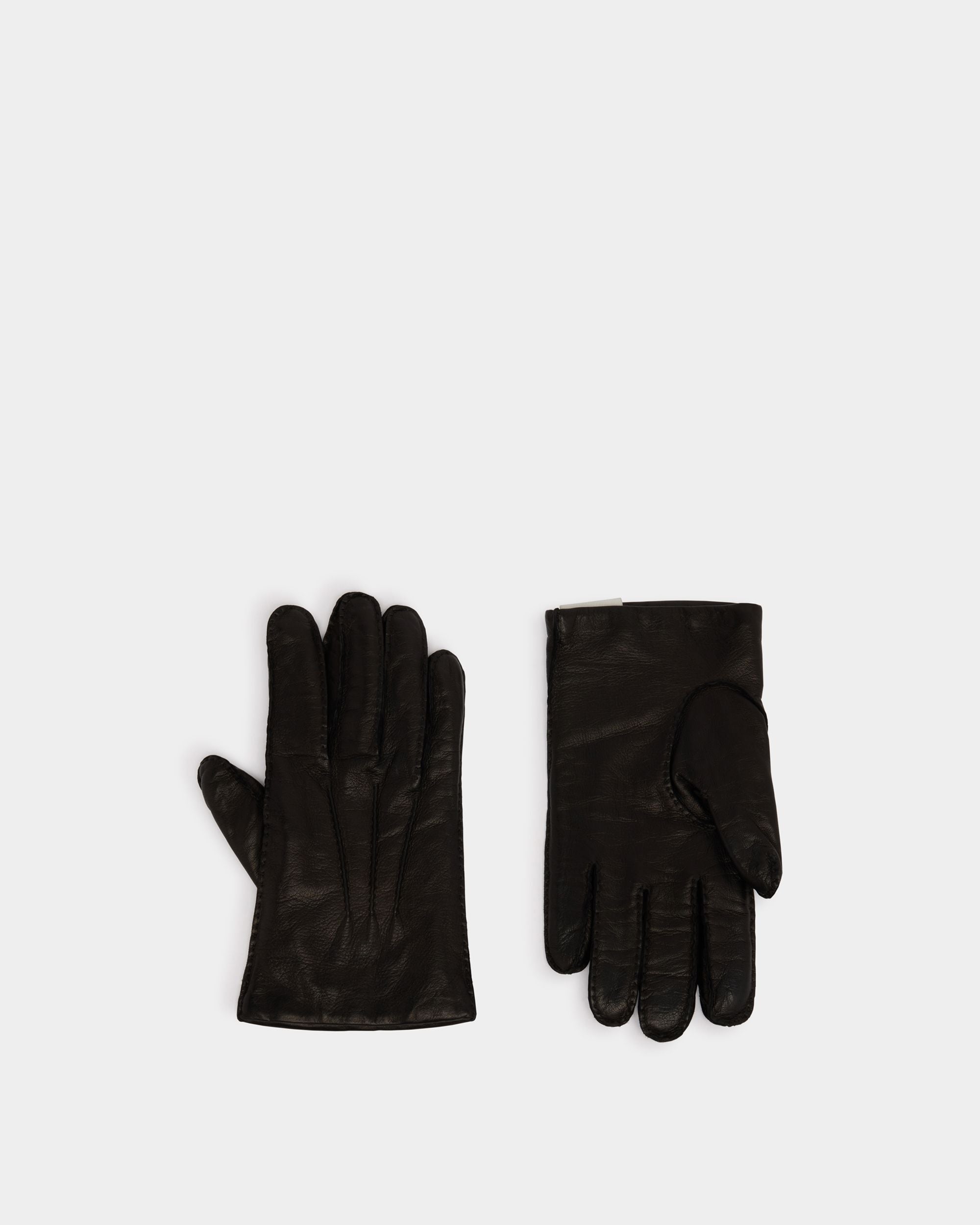 Black leather gloves in soft lambskin with pintuck stitching and a warm cashmere lining. A Bally Crest label in grosgrain embellishes the cuff.