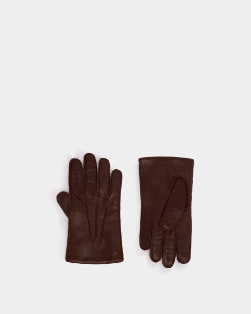 Brown leather gloves in soft lambskin with pintuck stitching and a warm cashmere lining. A Bally Crest label in grosgrain embellishes the cuff.