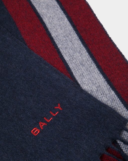 A red and white Bally Ribbon extends down the side of this navy blue scarf in a cashmere blend.