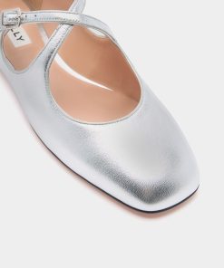 This Ballyrina flat is meticulously crafted in soft sheepskin with a silver finish. Two slender straps cross at the top, secured by a metal buckle inspired by a detail from the Bally archives. A square toe provides an on-point finish.