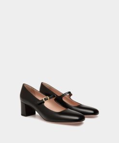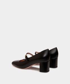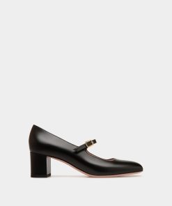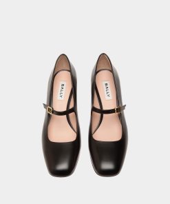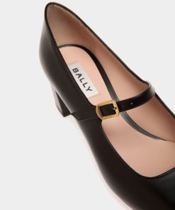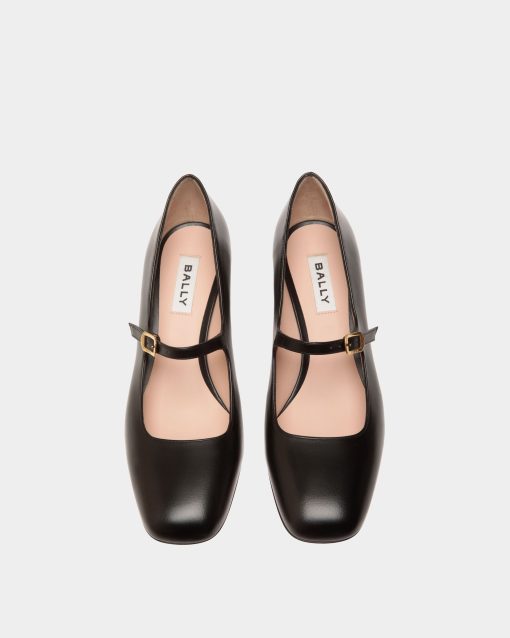 This black leather Ballyrina pump reimagines a classic ballet silhouette with a square toe and a block heel. A metal buckle inspired by hardware from the Bally archives fastens the Mary Jane strap.